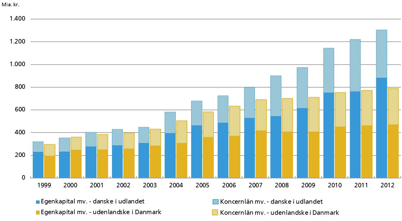 Danske direkte investeringer i udlandet steg i 2012 og udgjorde ved årets udgang 1.304 mia. kr. mod 1.222 mia. kr. året før. De udenlandske investeringer i Danmark steg ligeledes, men mere beskedent. De var således på 788 mia. kr. ultimo 2012 – en stigning på 17 mia. kr. i forhold til 2011.