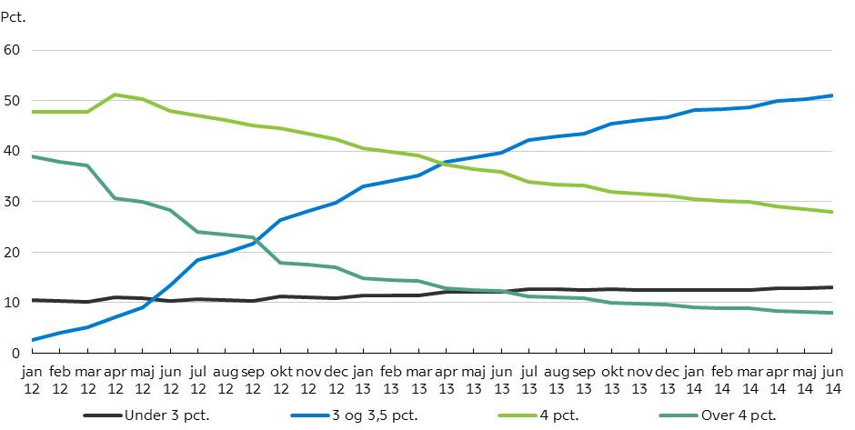 For første gang nogensinde udgør realkreditobligationer med kuponrenter på 3 og 3,5 pct. over halvdelen af den samlede udestående mængde af lange fastforrentede realkreditobligationer (restløbetid over 20 år). Andelen af obligationer med disse lave kuponrenter har været støt stigende siden deres introduktion i begyndelsen af 2012. I 1. halvår 2014 er der udstedt for 36 mia. kr., hvoraf obligationer med kupon på 3 pct. udgør 28 mia. kr. En stor del af tilgangen kan tilskrives konvertering af obligationer med kuponrente på 4 pct. eller mere.