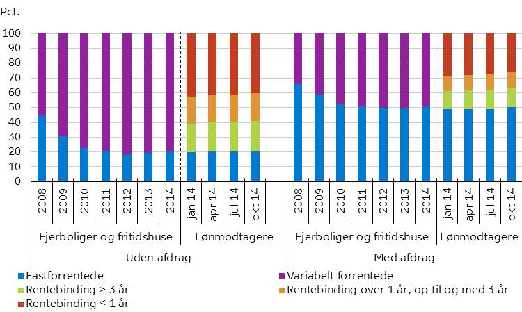 I løbet af 2014 er boligejernes rentefølsomhed på realkreditlån, både med og uden afdrag, faldet. Boligejere har således bevæget sig mod lån med længere rentebinding, hvor tilbagegangen i lån med rentebinding op til og med 1 år modsvares af en fremgang for variabelt forrentede lån med længere rentebinding. Der er desuden sket en mindre stigning i andelen af lån med fast rente.
