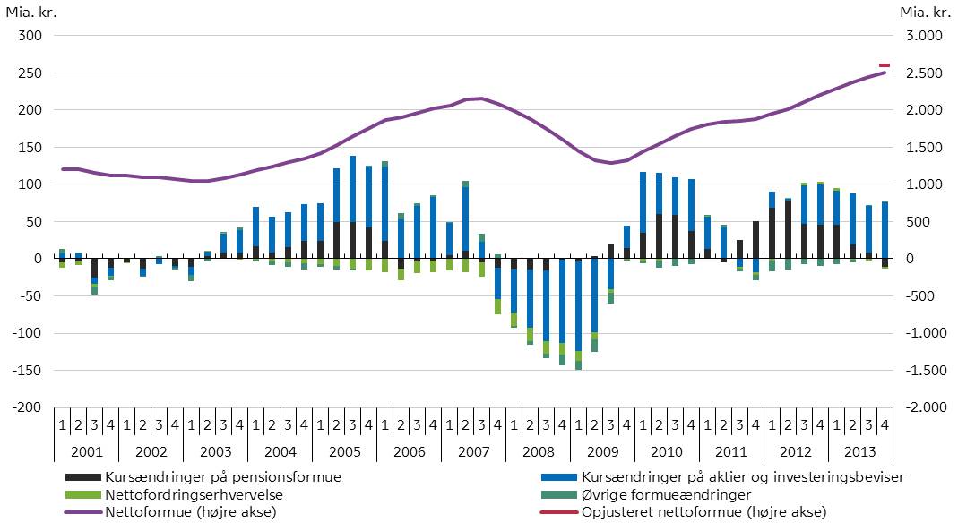 Danskernes finansielle nettoformue – forskellen på finansielle aktiver og passiver – er i løbet af 2013 vokset med godt 250 mia. kr. og nåede dermed op på 2.665 mia. kr. Størstedelen af ændringen set over året skyldes kursgevinster på aktier og investeringsbeviser, mens udviklingen i danskernes pensionsformue som følge af renteudviklingen derimod er faldet. Hertil kommer, at dele af statistikkens datagrundlag i 4. kvartal 2013 er revideret.