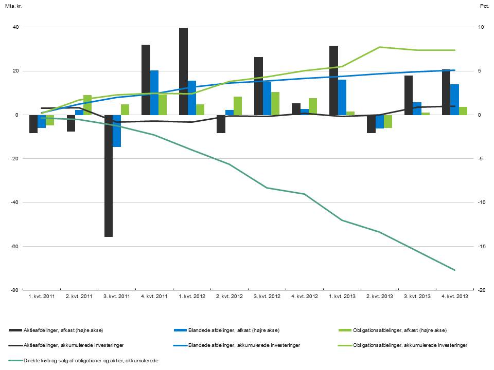 Af de nye investeringer er 30 mia. kr. placeret i obligationsafdelinger, heraf godt 27 mia. kr. med fokus på udenlandske obligationer, og 20 mia. kr. i blandede afdelinger, der investerer i både aktier og obligationer. Det samlede afkast af husholdningernes investeringer i obligationsafdelinger har i perioden været relativt lavt og faldende. Det dækker dog over et gennemsnitligt højere afkast i afdelinger med fokus på udenlandske obligationer. De blandede afdelinger har leveret et højere afkast end de rene obligationsafdelinger.