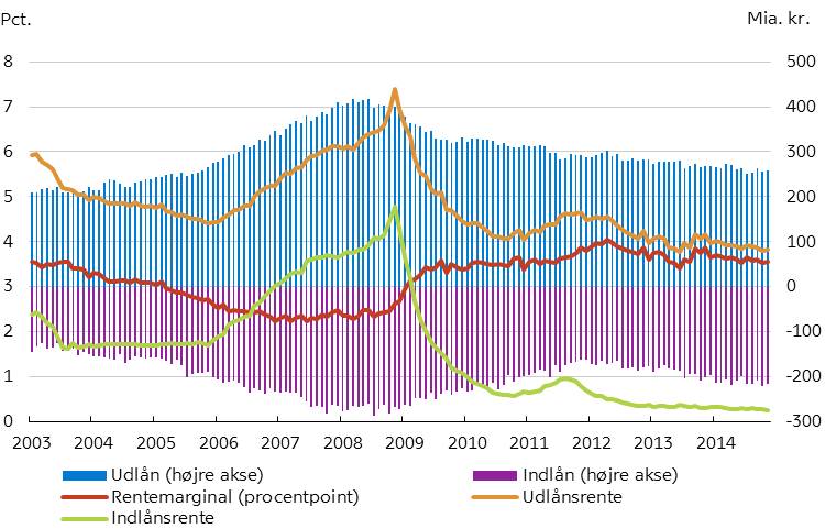 På trods af en relativt stabil rentemarginal er erhvervsvirksomhedernes nettorentebetalinger til bankerne (renteudgifter på lån minus renteindtægter på indskud) siden 2009 faldet betydeligt, fordi nettolåntagningen er reduceret med godt 70 mia. kr. Med til billedet hører, at faldet i rentebetalingerne til bankerne i nogen grad opvejes af rentebetalingerne til realkreditten som følge af substitutionen fra bank- til realkreditlån.