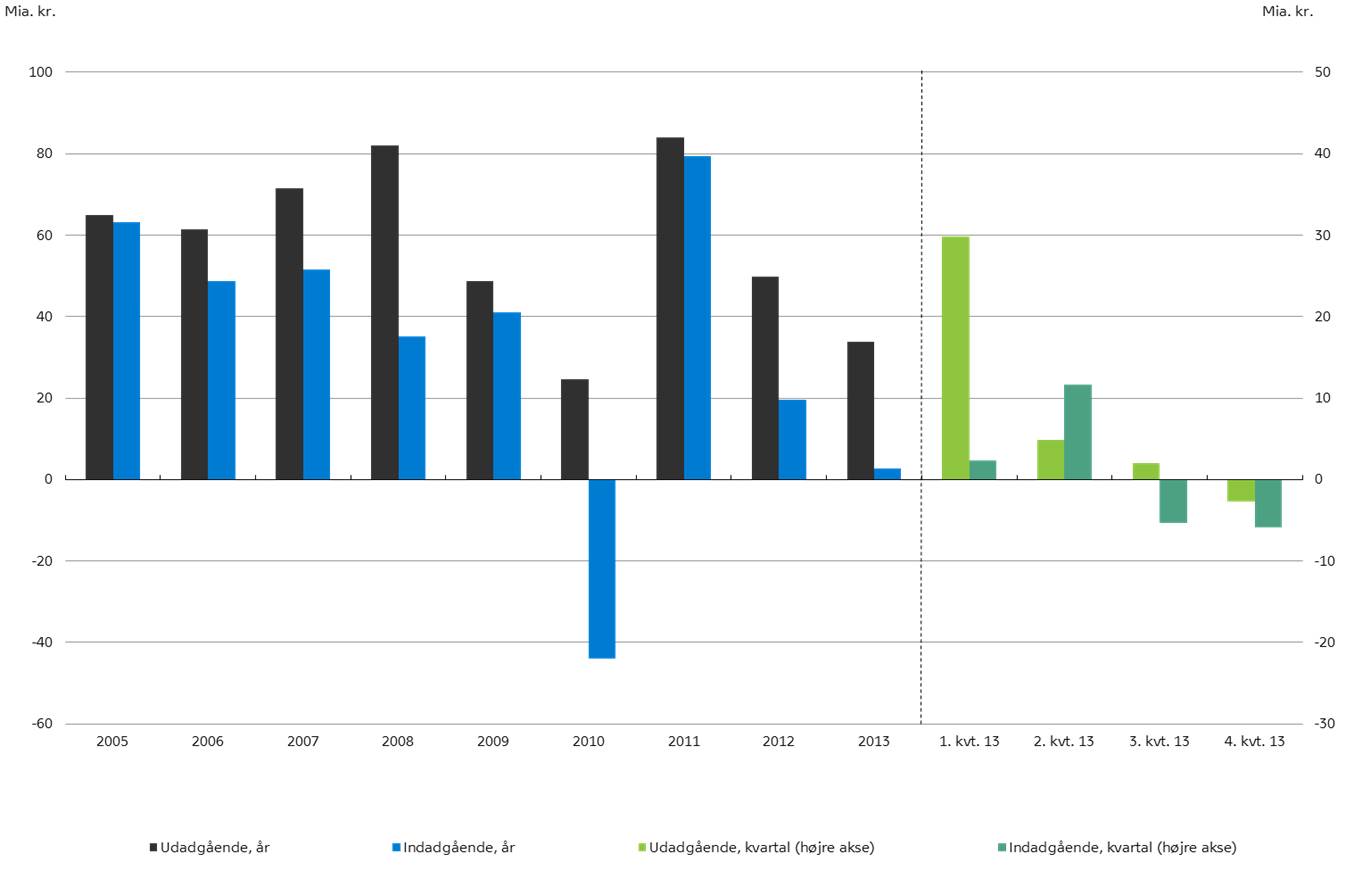 Hovedparten af de udadgående investeringer er foretaget i 1. kvartal, mens aktiviteten i de følgende tre kvartaler er markant lavere. I 1. kvartal dækker det over, at danske virksomheder tilførte deres udenlandske datterselskaber egenkapital for 17 mia. kr., mens de gav dem koncernlån for 12 mia. kr. De indadgående direkte investeringer blev øget i 1. halvår 2013, mens de blev reduceret i 2. halvår.