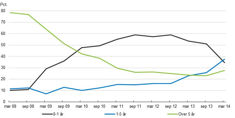 Udlandets beholdning af mellemlange realkreditobligationer (restløbetid mellem 1 og 5 år) er fra september 2013 steget med 12 procentpoint og udgør nu 38 pct. af deres portefølje af realkreditobligationer. Til sammenligning er deres beholdning af korte obligationer (restløbetid op til og med 1 år) reduceret fra 51 til 35 pct. Dermed ligner sammensætningen nu i langt højere grad markedsporteføljen (det samlede udbud af realkreditobligationer).