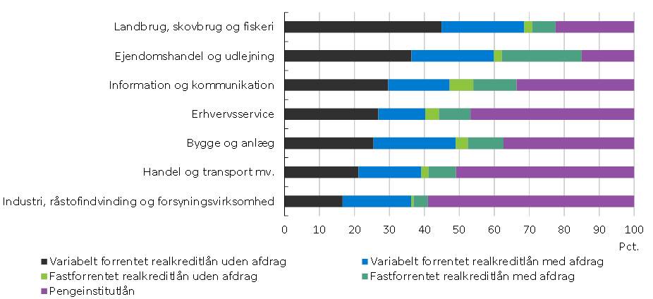 Anm.: Ændringerne i bank- og realkreditudlånet er beregnet på indeks over nominelle beholdninger og angiver således ændringerne i den udestående mængde, der skyldes nettotransaktioner. De enkelte branchers type af realkreditlån, som vises i figuren, offentliggøres ikke i statistikbanken.