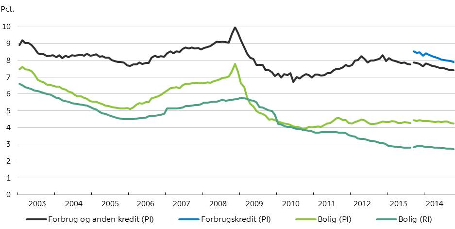 Trods faldende renter på lån til forbrug og andet formål er der stadig en betydelig afstand ned til renterne på pengeinstitutternes lån til husholdninger mod sikkerhed i fast ejendom, som har ligget relativt stabilt og kun er faldet meget svagt siden midten af 2011. I modsætning hertil er realkreditinstitutternes renter (inkl. bidragssatser) igennem de seneste tre år faldet med ca. 1 procentpoint, bl.a. som følge af refinansieringer og omlægninger af lån til lavere renter.