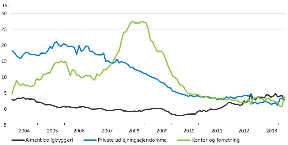 Udviklingen i realkreditudlånet til private udlejningsejendomme har været positiv men faldende siden 2005, hvor årsvæksten lå på over 20 pct. Til sammenligning toppede udlånsvæksten i ejendomstypen kontor og forretning først i 2009, men med en årsvækst på over 25 pct. Siden midten af 2010 er udlånet til de to ejendomstyper vokset jævnt. Udlånet til alment boligbyggeri har generelt udviklet sig mere fladt, men er dog gået noget frem siden begyndelsen af 2012.