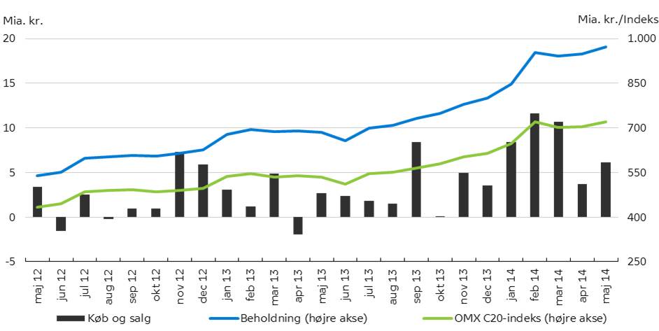 Udlændinge købte i maj danske aktier for 6 mia. kr. og har samlet købt danske aktier for godt 40 mia. kr. i 2014, dvs. allerede nu overstiger det deres samlede køb i 2013, som var på 32 mia. kr.