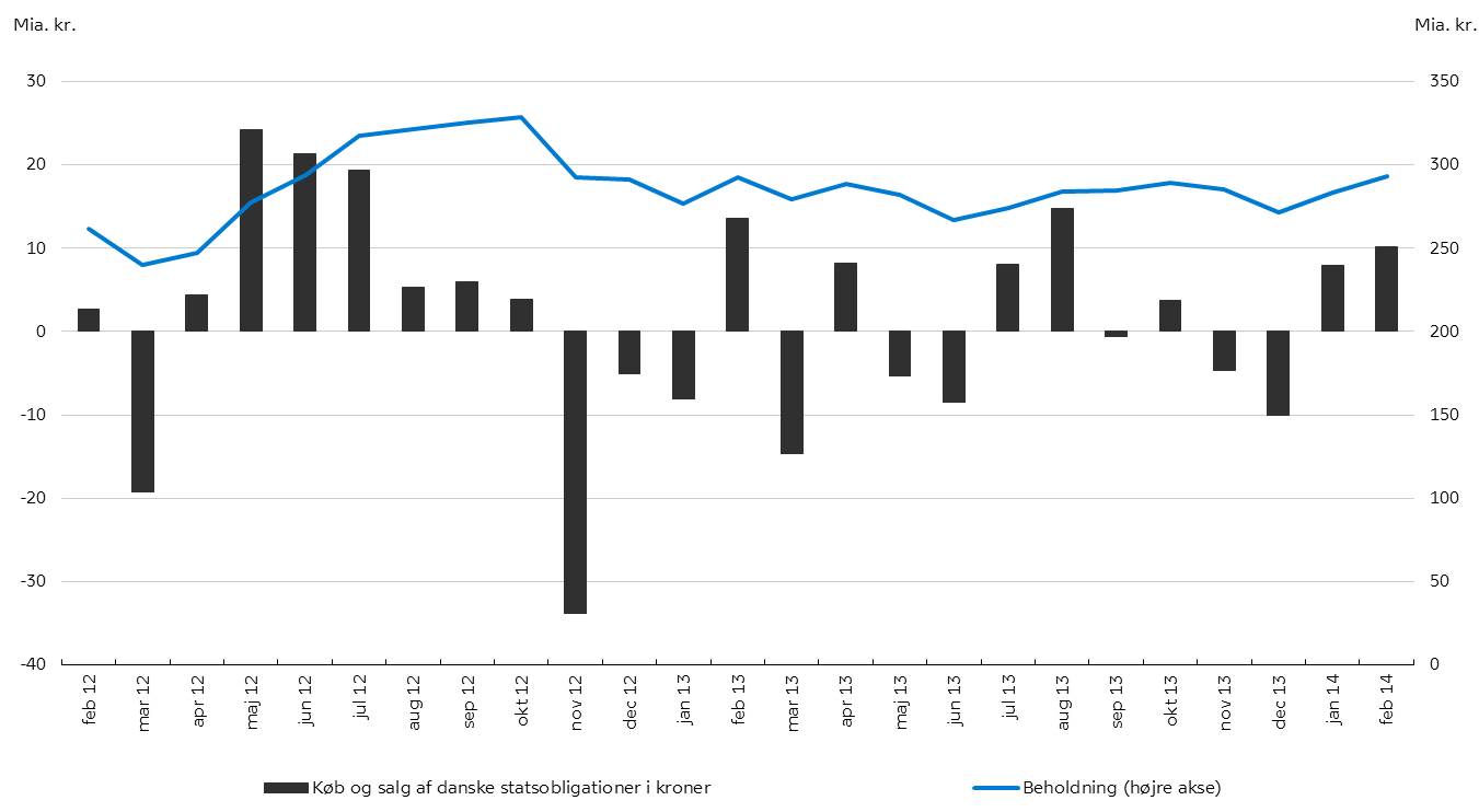 Udenlandske investorer købte i februar 2014 danske statsobligationer i kroner for 10 mia. kr. De har dermed i januar og februar 2014 øget deres beholdning med 18 mia. kr. De har primært vist interesse for statsobligationer med en løbetid på 5-10 år, og disse papirer udgør over halvdelen af deres samlede køb. I samme periode har staten udstedt kroneobligationer for 23 mia. kr., heraf 5-10-årige papirer for knap 9 mia. kr.