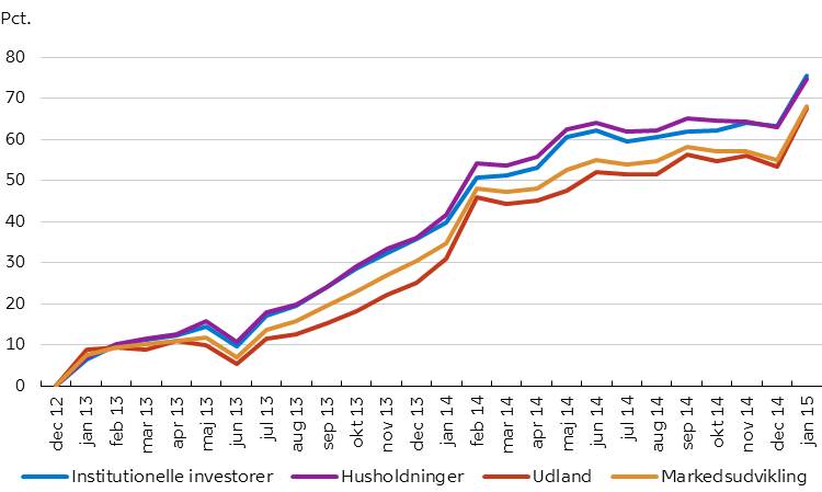Det er især danske husholdninger og institutionelle investorer, der har nydt godt af udviklingen. Deres afkast ligger ved udgangen af januar på godt 75 pct. og overgår dermed markedsudviklingen set under ét. Det er især trukket af stigninger i Coloplast, Danske Bank og Vestas.