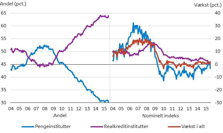 Pengeinstitutternes andel af MFI-sektorens erhvervsudlån har ligget fladt i det seneste år efter at være faldet siden 2009. Den faldende andel skyldes, dels at mange erhvervsvirksomheder gennem krisen omlagde lån fra penge- til realkreditinstitutter, dels at pengeinstitutterne havde større tab på deres udlån. Deres andel af erhvervsudlånet har siden midten af 2014 ligget på godt 30 pct., mens andelen på sit højeste i 2008 var over 50 pct.