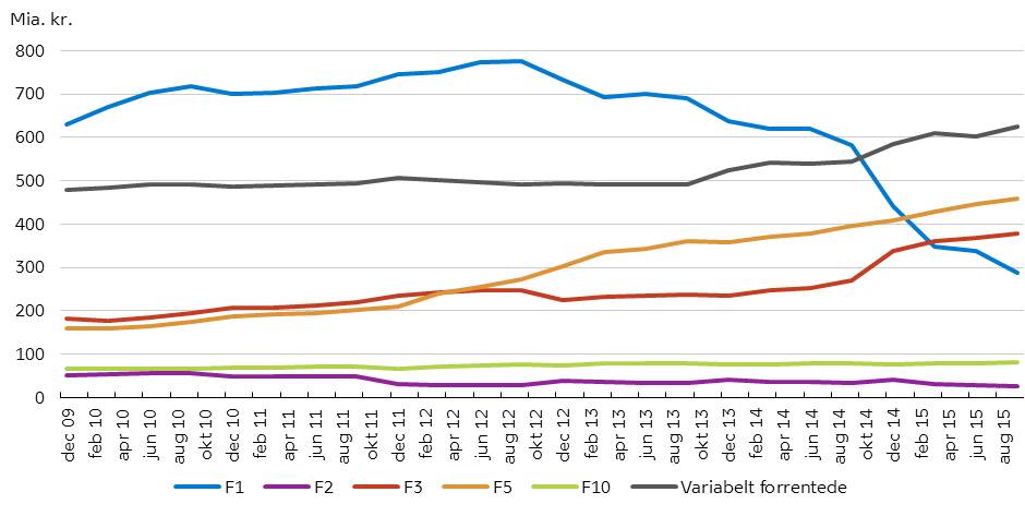 Ved udgangen af september var der udstedt realkreditobligationer bag lån med årlig refinansiering (F1-lån) for i alt 287 mia. kr. Dermed er den udestående værdi af disse obligationer godt en tredjedel af niveauet for tre år siden, hvor det toppede. Alene i 3. kvartal 2015 faldt den udestående værdi med 50 mia. kr. De øvrige obligationer bag variabelt forrentede lån steg i samme periode med 42 mia. kr.
