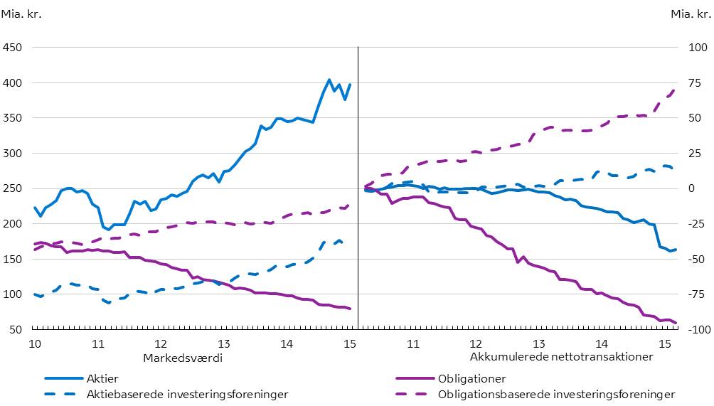 Anm.: Husholdningernes investeringer i aktier og obligationer omfatter både danske og udenlandske værdipapirer. Investeringerne i obligations- og aktierelaterede investeringsforeninger dækker over danske investeringsforeninger med fokus på danske og udenlandske værdipapirer. Figurens tidshorisont afspejler den periode, hvori det er muligt at udtrække data for investeringsforeningernes investeringspolitik. Faldet i akkumulerede nettotransaktioner af husholdningernes beholdning i aktier i april 2015 skyldes et sektorskifte fra husholdningssektoren til sektoren for ikke-finansielle virksomheder.