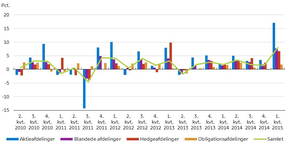 Afkastene på aktier har været særligt store i begyndelsen af 2015, og det har givet husholdningerne et ekstraordinært højt afkast i aktieafdelinger på 17 pct. i 1. kvartal. Da også blandede afdelinger og hedgeafdelinger har givet pæne gevinster, lander kvartalets afkast på husholdningernes samlede formue i investeringsforeninger på næsten 8 pct.