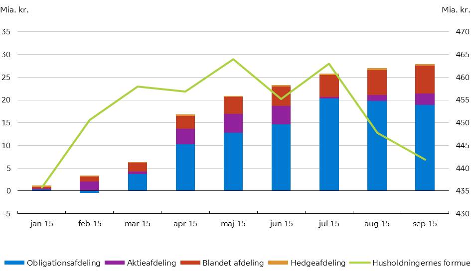 Husholdningerne har i 2015 hovedsageligt investeret i obligationsafdelinger og blandede afdelinger, men har siden august foretrukket aktier på bekostning af obligationer. Udvidelsen af aktieporteføljen de seneste måneder er især drevet af globale og nordamerikanske aktier, mens husholdningerne især har nedbragt deres beholdning af korte danske og mere risikobetonede udenlandske obligationer.