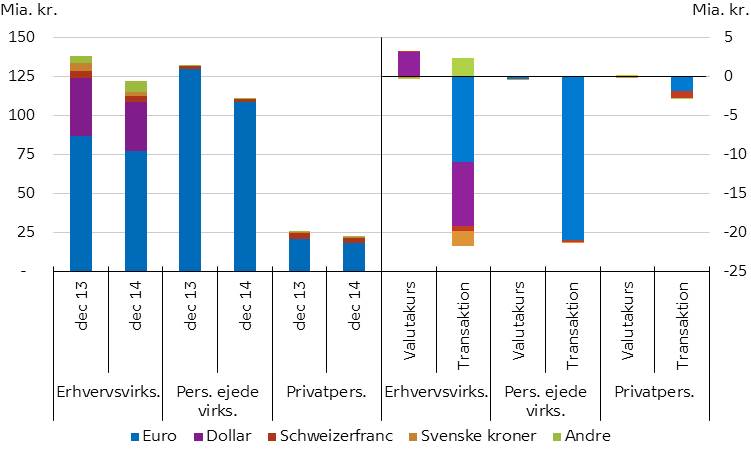 Danske erhvervsvirksomheder, personligt ejede virksomheder og privatpersoner nedbragte gennem 2014 deres lån i udenlandsk valuta hos danske banker og realkreditinstitutter med mellem 12 og 16 pct. Overordnet set betalte låntagerne mere af på lånene, end de optog ny gæld, mens valutakursændringer isoleret set øgede gælden.