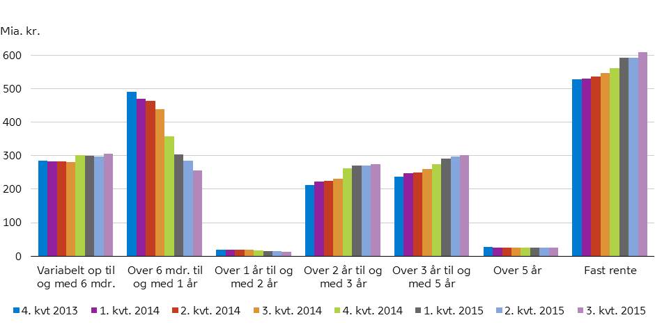 Samtidig øges også husholdningernes lån med rentebinding til og med 6 måneder. Langt hovedparten af de lån er tilknyttet en referencerente og skal derfor ikke refinansieres ved hver rentetilpasning. Endelig er der fremgang for lån med fast rente, som ved udgangen af 3. kvartal udgør 34 pct. af det samlede realkreditudlån til husholdninger.