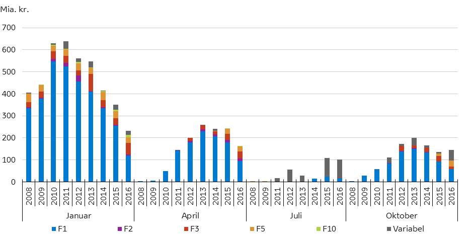 Anm.: Opgjort til nominel værdi dagen før ordinært udløb af obligationerne. Opgørelser af udløb efter oktober 2015 er dog opgjort på baggrund af den udestående værdi på det tidspunkt. På grund af afdrag og førtidige indfrielser afviger refinansieringsbehovet fra udløbet. Fordelingen af korte fastforrentede obligationer på lån med forskellig refinansieringsfrekvens er estimeret på baggrund af ændringerne i det nominelle udestående i forskellige restløbetidsintervaller. "F5" er opgjort som ændringerne i det nominelle udestående 5,5-3,5 år før obligationernes udløb, "F3" er opgjort for 3,5-2,5 år, og "F1" for 1,5-0 år.