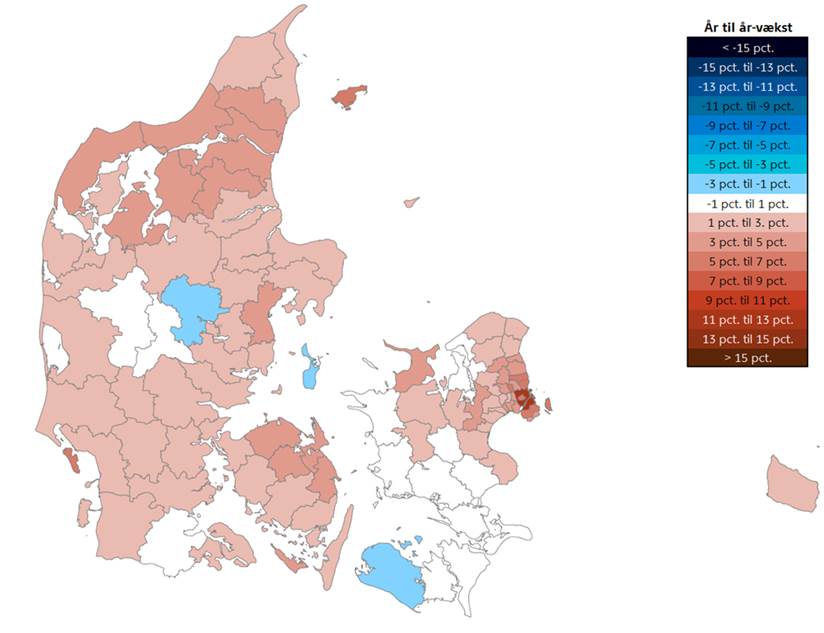 I langt størstedelen af landet udsteder realkreditinstitutterne flere lån til danske husholdninger, end der indfries. I 82 af de 98 kommuner er udlånsaktiviteten (udtrykt ved nettonyudlån) således positiv set over det seneste år. Generelt har aktiviteten været mest positiv i hovedstadsområdet og omkring de større byer, mens den i Syd- og Vestsjælland har været afdæmpet. I tre kommuner har der været et begrænset fald på 1-3 pct.