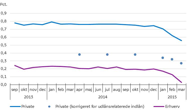 Renten på indlån på anfordring er siden årsskiftet faldet med knap 0,2 procentpoint for både private og erhverv, og ultimo marts er den i gennemsnit henholdsvis 0,56 og 0,03 pct. Udviklingen kan relateres til de faldende pengemarkedsrenter, som bl.a. skyldes Nationalbankens nedsættelser af indskudsbevisrenten.