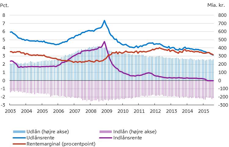 Pengeinstitutternes rentemarginal over for erhverv (spændet mellem den gennemsnitlige ud- og indlånsrente) er faldet gennem en længere periode og landede i august på godt 3,2 procentpoint. Den har ikke været så lav siden begyndelsen af 2009, hvor den til gengæld var i hastig stigning fra knap 2,5 procentpoint i årene op til krisen for at toppe med 4 procentpoint i 2012. Det seneste fald har været drevet af renterne på udlån, mens den gennemsnitlige indlånsrente, efter at være faldet i april, har ligget stabilt omkring nul.
