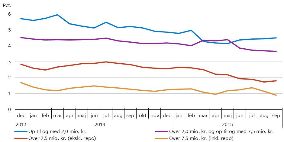I september udgjorde lån udstedt med sikkerhed i værdipapirer (repoudlån) godt 57 pct. af bankernes nye udlån større end 7,5 mio. kr. Da de er karakteriseret ved kort løbetid og større sikkerhed end øvrige udlån, ligger renten lavere og trækker derfor den samlede rente på de største nye udlån ned.