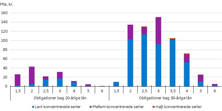 Anm.: Opgørelse af det nominelle udestående ultimo maj 2015. Opgørelsen omfatter fastforrentede obligationer med oprindelig løbetid på 20-24 år (obligationer bag 20-årige obligationer) og oprindelig løbetid på 30-34 år (obligationer bag 30-årige obligationer). Obligationer med kupon 4,5 pct. og over 6 pct. er ikke medtaget på grund af et meget begrænset udestående. Opgørelsen af ejerkoncentration svarer til den månedlige offentliggørelse. Det vil sige, at serier med lav ejerkoncentration har en maksimal ejerandel på under 20 pct., serier med mellem ejerkoncentration har en maksimal ejerandel fra 20 til 50 pct., og serier med høj ejerkoncentration har en maksimal ejerandel på 50 pct. eller mere. Serier, som alene ejes af udstederen, har en samlet nominel værdi på mindre end 0,1 mia. kr. og er udeladt.
