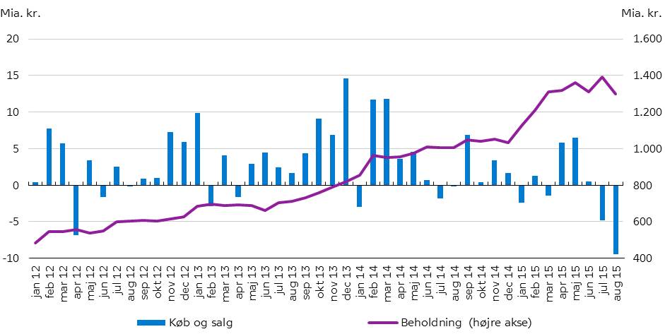 I august solgte udenlandske investorer danske værdipapirer for 3 mia. kr. De solgte aktier for 9 mia. kr., mens de netto købte obligationer for 6 mia. kr.