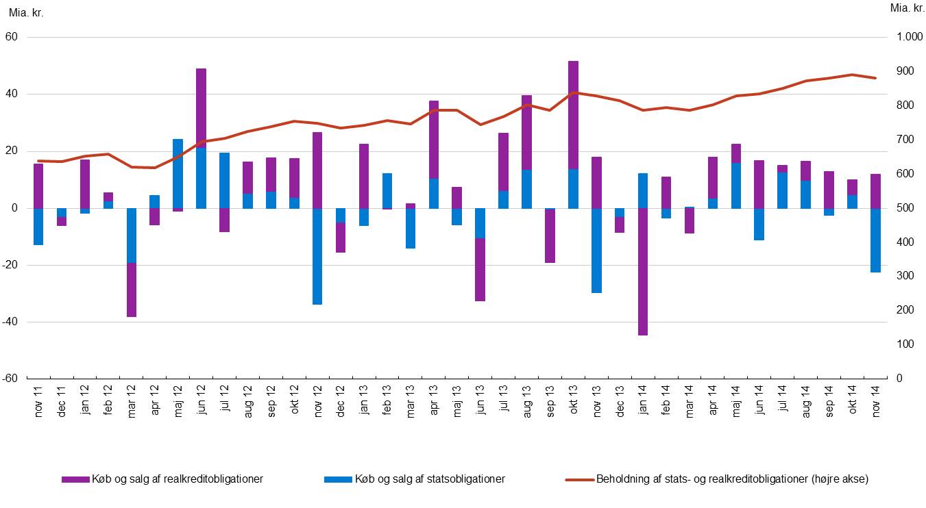 Udlændinge har i november købt danske statspapirer og realkreditobligationer for 25 mia. kr. – stort set ligeligt fordelt mellem de to obligationstyper. Interessen har primært været koncentreret omkring papirer med kort restløbetid. Ud over købene har de fået indfriet danske statspapirer for 36 mia. kr. i forbindelse med udløbet af 2 pct. stående lån 2014. Samlet set er deres beholdning af danske obligationer derfor reduceret med 10 mia. kr.
