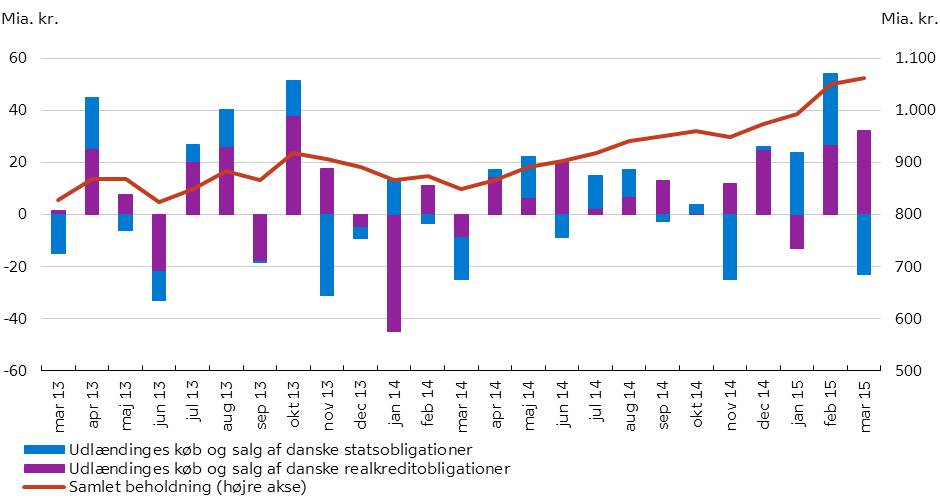 I marts 2015 har udenlandske investorer købt danske obligationer for 9 mia. kr. Dermed fortsætter udviklingen siden december 2014, hvor udlandet i perioden samlet har købt for 100 mia. kr. Til sammenligning købte udlandet for 61 mia. kr. i 2014.