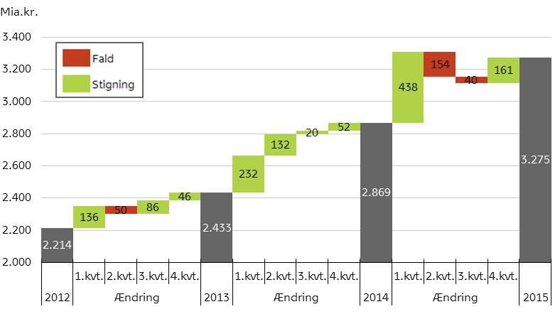 Danske husholdningers finansielle nettoformuer – forskellen på deres finansielle aktiver og passiver – voksede i 2015 med godt 400 mia. kr. til 3.275 mia. kr. Det svarer til en stigning på godt 145.000 kr. for en gennemsnitshusstand, som dermed er god for lidt over 1,2 mio. kr. Af de godt 400 mia. kr. udgør husholdningernes opsparingsoverskud fratrukket reale investeringer i 2015 knap 100 mia. kr. eller i gennemsnit 37.000 kr. pr. husstand. Det historisk store opsparingsoverskud er drevet af, at danskernes disponible bruttoindkomster er steget, samtidig med at udviklingen i forbruget har været behersket. Overskuddet er primært anvendt til at indbetale på pensioner, købe investeringsforeningsbeviser og øge indskud i bankerne. Den resterende del af stigningen i den finansielle nettoformue – godt 300 mia. kr. – kan tilskrives kursgevinster på værdipapirer og pensionsformuer i både 1. og 4. kvartal, mens der modsat var kurstab i 2. og 3. kvartal.