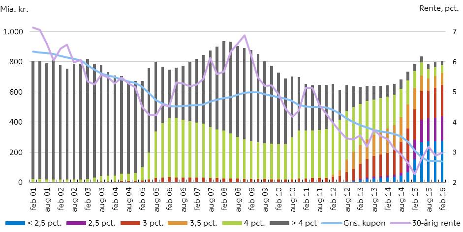 Fordi låntagerne i høj grad har omlagt lån til lavere rente, har den gennemsnitlige kuponrente for de udestående obligationer fulgt markedsrenten ned. I februar 2012 var den gennemsnitlige kuponrente 4,4 pct., mens den ved udgangen af februar 2016 havde stabiliseret sig på 2,7 pct. Hvis den 30-årige rente forbliver over den gennemsnitlige kuponrente, vurderes potentialet for lånomlægninger at være ret beskedent.