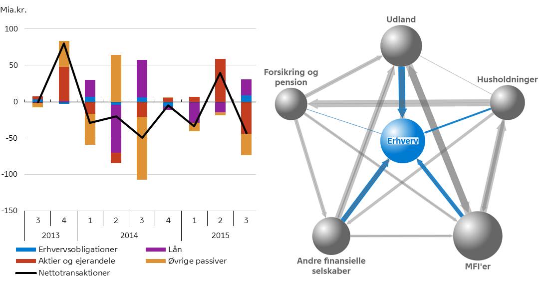 Danske erhvervsvirksomheder havde i 3. kvartal et betydeligt opsparingsoverskud. Derudover reducerede de i mindre omfang deres aktiver. Samlet set nedbragte det deres finansiering med godt 43 mia. kr. Transaktionerne på passivsiden dækker over betydelige aktieindfrielser (tilbagekøb mv.), som kun delvist modsvares af, at virksomhederne udstedte erhvervsobligationer og øgede låntagningen erhvervsvirksomhederne imellem.
