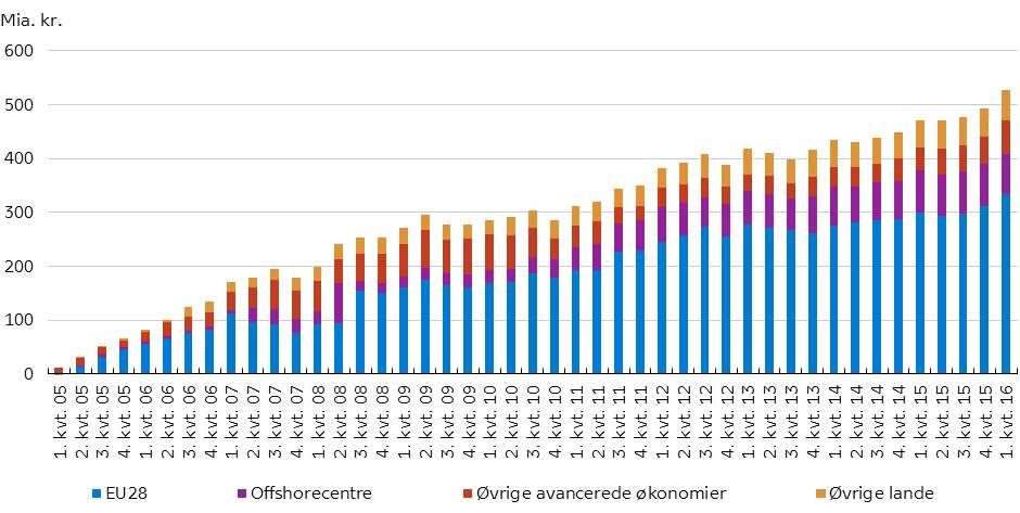 Anm.: Opgørelsen er lavet på akkumulerede direkte investeringer (transaktioner) opgjort efter retningsprincippet eksklusive geninvesteret indtjening. Offshorecentre er en landegruppe, der defineres af IMF. En fuldkommen liste over offshorecentre og EU28 findes under "Yderligere information". Direkte investeringer i øvrige lande udgjorde kun -0,7 mia. kr. i 1. kvartal 2005 og fremgår ikke af figuren.