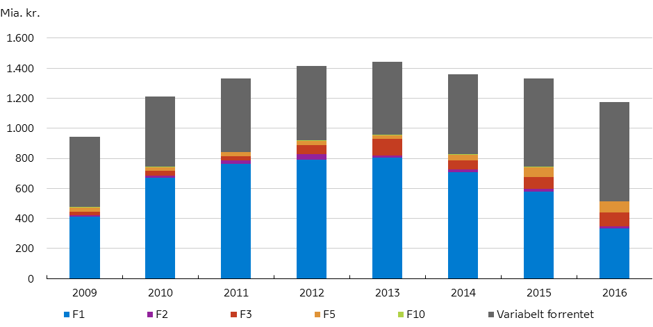 I løbet af 2016 skal realkreditlån for 1.185 mia. kr. have ny rente. Det drejer sig om variabelt forrentede lån for 660 mia. kr. og rentetilpasningslån for 525 mia. kr. Det er det laveste niveau siden 2009, hvilket til dels skyldes, at stadig flere konverterer til fastforrentede lån, og at de helt korte rentetilpasningslån, de såkaldte F1-lån, falder. I 2012 og 2013 udgjorde F1-lånene over halvdelen af de lån, som skulle have ny rente. Med realkreditsektorens tilpasninger af prisstrukturen (ændrede satser for bidrag og kursskæring), som favoriserer lån med længere rentebinding, er andelen af F1-lån faldet. Dermed udgør de i år kun knap en tredjedel af mængden af lån, der skal have ny rente.