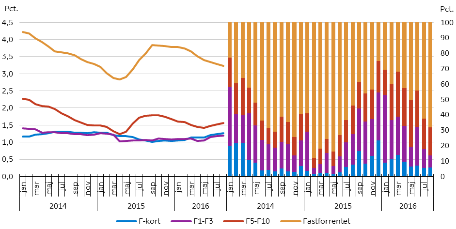 Forskellen i den effektive rente mellem fastforrentede lån og flekslån er igen i 2016 indsnævret – bl.a. fordi bidragssatserne på lån med kort rentebinding er steget mere end på de fastforrentede lån. De fastforrentede lån er siden begyndelsen af året blevet billigere, mens flekslånene er blevet dyrere. I takt med at forskellen bliver mindre, optager lønmodtagerne i stigende grad nye fastforrentede lån på bekostning af bl.a. F-kort-lån.