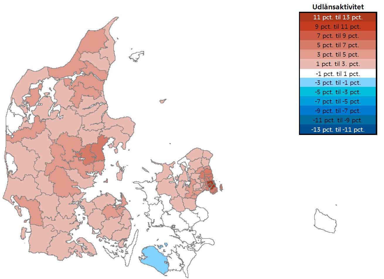 De danske husholdninger fortsætter med at optage nye realkreditlån i deres ejerboliger og fritidshuse. I langt de fleste af landets kommuner har nyudlånet således oversteget de ekstraordinære indfrielser over de seneste 12 måneder. Udlånsaktiviteten er særlig høj i hovedstadsområdet – men også de øvrige større byer følger pænt med. Nogle kommuner uden for de større byer, især på Sydsjælland og øerne, har begrænset, ingen eller ligefrem negativ udlånsaktivitet.