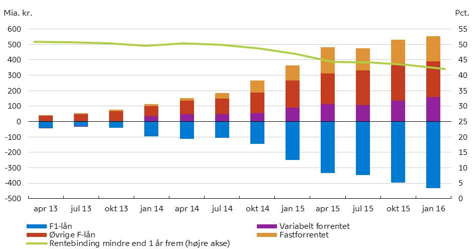 | Akkumuleret ændring i realkreditlån fordelt på type fra januar 2013 til januar 2016 |