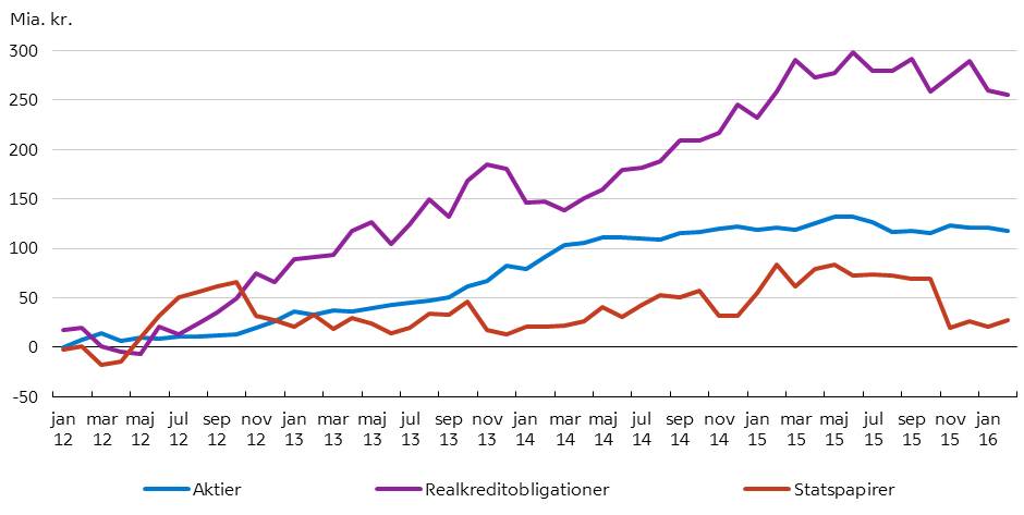 Udenlandske investorer har udvist stor og vedholdende interesse for danske aktier og obligationer de seneste år. Siden januar 2012 har de købt obligationer for 280 mia. kr. og aktier for 120 mia. kr. Opkøbsbølgen stilnede af i anden halvdel af 2015, og i de første to måneder af 2016 har udlændinge samlet set solgt en smule fra. Udviklingen i 2015 er bl.a. påvirket af tilbagekøbsprogrammer for Pandora-aktien og Novo Nordisks B-aktie, hvor udlandets ejerandel er over 70 pct.