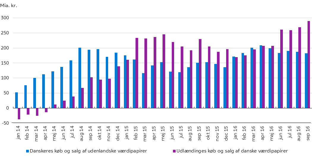 I september 2016 solgte danske investorer udenlandske værdipapirer for 5 mia. kr., mens udenlandske investorer købte danske værdipapirer for 21 mia. kr., heraf aktier for 19 mia. kr. Danske investorer solgte udenlandske obligationer for 13 mia. kr. og købte aktier for 8 mia. kr.