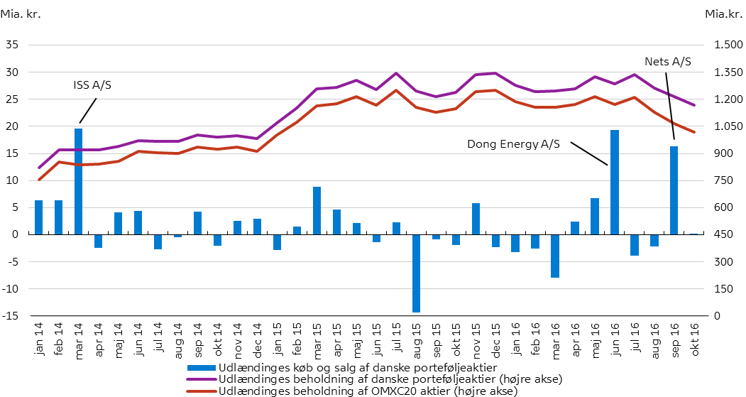 Anm.: Udenlandske investorers køb af danske aktier påvirkes positivt ved børsnoteringerne af ISS A/S i marts 2014, Dong Energy A/S i juni 2016 og Nets A/S i september 2016.