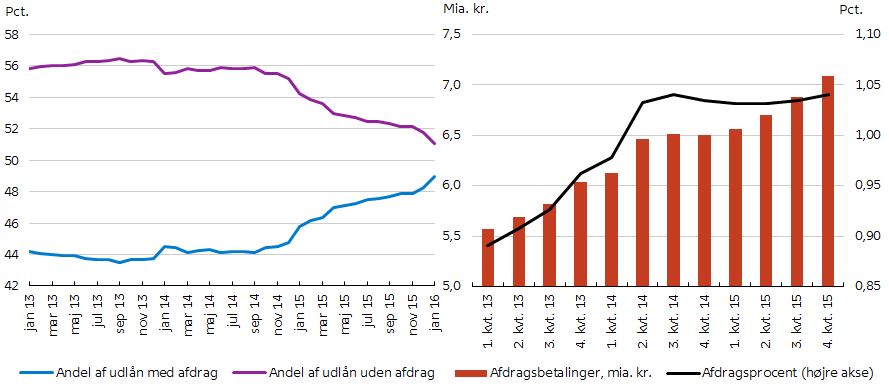 Andelen af realkreditlån med afdrag er steget hastigt siden 3. kvartal 2014 og udgør nu næsten halvdelen af de samlede realkreditlån til ejerboliger og fritidshuse. Alene i januar 2016 steg lån med afdrag med godt 10 mia. kr. til 708,5 mia. kr. – næsten udelukkende fordi afdragsfriheden udløb.