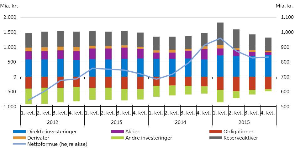 Ved udgangen af 4. kvartal 2015 bestod udlandsformuen af nettoaktiver på 1.318 mia. kr., hvoraf direkte investeringer tegnede sig for omtrent halvdelen, og nettopassiver bestod af obligationer og andre investeringer på i alt 484 mia. kr.