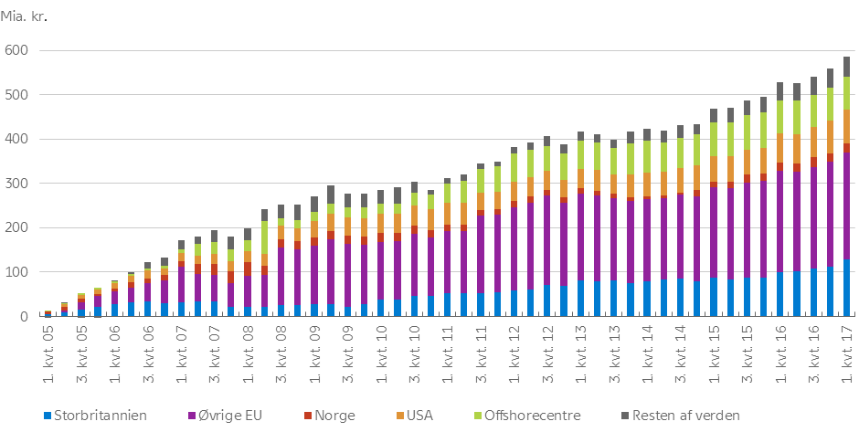 Danske direkte investeringer i udlandet steg med knap 27 mia. kr. i 1.kvartal 2017. Stigningen er nogenlunde ligeligt fordelt på koncernlån og egenkapitalinvesteringer med henholdsvis 11 og 15 mia. kr.