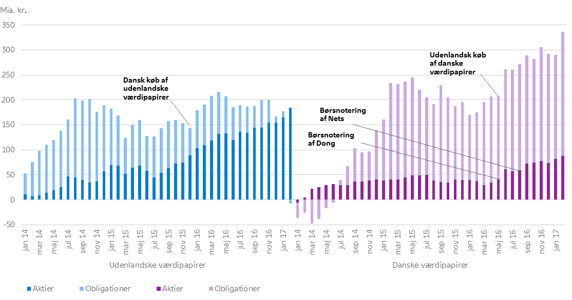 Danske investorer købte udenlandske aktier for 20 mia. kr. i februar 2017. Dermed fortsætter de senere års tendens, hvor de – primært forsikrings- og pensionssektoren – i overvejende grad fokuserer på aktier, når de køber udenlandske værdipapirer. Interessen skyldes det lave renteniveau og ønsket om at opnå mest muligt afkast af deres investeringer. Siden begyndelsen af 2014 har danske investorer købt udenlandske aktier for 184 mia. kr. og afhændet udenlandske obligationer for 8 mia. kr. Samlet set har de i perioden købt amerikanske aktier for 89 mia. kr. og aktier fra EU-området for 76 mia. kr.