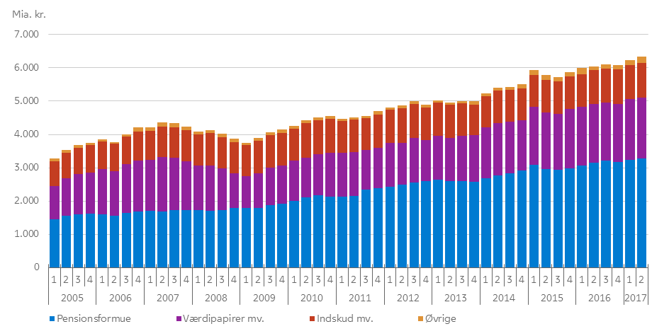 I 2. kvartal 2017 fortsatte værdien af danske husholdningers finansielle aktiver med at stige og nåede op på godt 6.300 mia. kr., svarende til ca. 2,37 mio. kr. pr. husholdning, som omfatter både private og selvstændige. Mere end halvdelen af de finansielle aktiver udgøres af pensionsformue (52 pct.), hvoraf hovedparten dog først beskattes ved udbetaling. I 2. kvartal steg denne del af danskernes aktiver med yderligere godt 40 mia. kr. Udviklingen i pensionsformuen afspejler såvel markedsudviklingen som det faktum, at det danske pensionssystem fortsat er under opbygning, dvs. pensionsindbetalingerne overstiger -udbetalingerne.