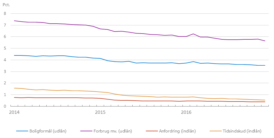 Bankernes ud- og indlånsrenter over for husholdningerne fortsatte med at falde i 2016. På udlånssiden faldt renterne på lån med sikkerhed i fast ejendom og forbrugslån med henholdsvis 0,15 og 0,40 procentpoint. Indlånsrenterne faldt også – dog mest udtalt for tidsindskud, da renten på anfordringsindlån er tæt på 0 pct., når man ser bort fra udlånsrelaterede indlån og øvrige særlige indlån. Rentespændet mellem tidsindskud og anfordringsindlån blev således indsnævret i løbet af året.