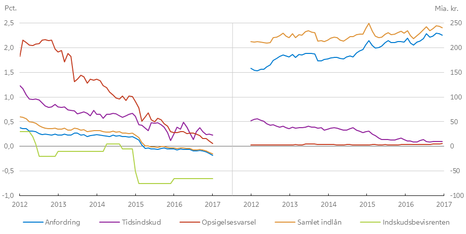 Erhvervsvirksomhedernes indlånsrenter i bankerne er faldet igennem 2016 – særligt udtalt siden november – og er i januar nede på i gennemsnit -0,16 pct. På trods af at tidsindskud og indlån med opsigelsesvarsel fortsat forrentes med positive renter, udgør de kun en meget lille del af det samlede indlån, mens de negativt forrentede anfordringslån er steget med godt 11 mia. kr. siden begyndelsen af 2016. Anfordringsindlån udgjorde ved udgangen af januar således knap 94 pct. af det samlede indlån for erhvervsvirksomheder.