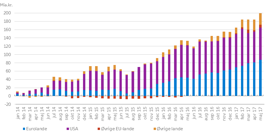 Danske investorer har købt udenlandske aktier og investeringsforeningsbeviser for 15 mia. kr. i maj 2017. De har dermed fortsat stor interesse for porteføljeaktier, og siden begyndelsen af 2014 har de samlet set investeret for knap 200 mia. kr. i disse aktier. I samme periode har de i alt solgt udenlandske obligationer for cirka 30 mia. kr.