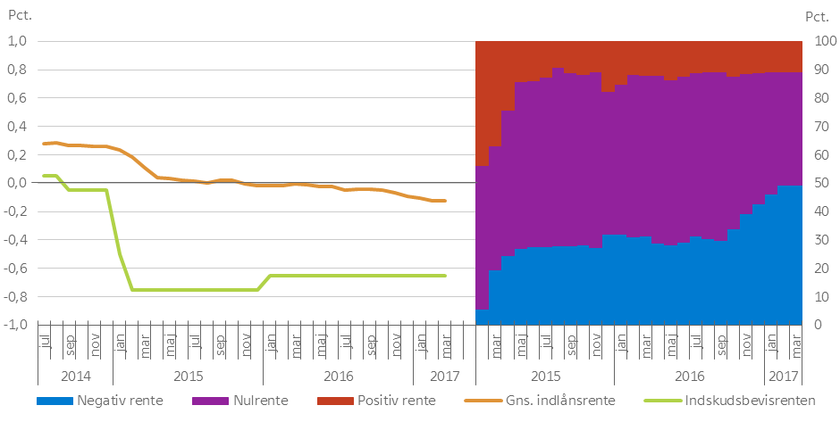 Knap 50 pct. af erhvervsvirksomhedernes samlede indlån på 285 mia. kr. har ved udgangen af marts en negativ rente. Det er en stigning på 18 procentpoint i løbet af det seneste år og er bl.a. udtryk for, at bankerne tilpasser sig den negative rente på indskudsbeviser. Omkring 40 pct. af erhvervsindlånene har nulrente og godt 10 pct. har positiv rente. Sammensætningen betyder, at virksomhederne i 1. kvartal 2017 samlet set har haft nettoudgifter på godt 85 mio. kr. for at have penge stående i banken, mens privatpersoner stadig ikke betaler for det.